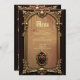 Elegant luxurious heart emblem.The design features an ornate, arched golden frame against a gradient brown background. The frame is highly detailed with baroque-style flourishes. Hanging from the top of the arch are delicate golden chains with teardrop pendants. At the bottom centre, a smaller, similarly styled golden frame displays a red heart emblem flanked by winged serpents. The overall mood is luxurious and decorative.