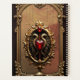 Elegant luxurious heart emblem. The design features an ornate, arched golden frame against a gradient brown background. The frame is highly detailed with baroque-style flourishes. Hanging from the top of the arch are delicate golden chains with teardrop pendants. At the bottom centre, a smaller, similarly styled golden frame displays a red heart emblem flanked by winged serpents. The overall mood is luxurious and decorative.