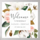 This elegant magnolia white and blush welcome wedding poster is perfect for a modern classy wedding. The soft floral design features watercolor blush pink peonies, stunning white magnolia flowers and cotton with gold and green leaves in a luxurious arrangement. Customize the poster with the name of the bride and groom, and the date of the wedding.