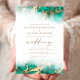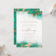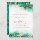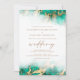 This elegant wedding invitation features a teal green watercolor border design in imitation of marble veined with faux gold foil, fading gradually into the white background. The word "wedding" appears in gold-coloured handwriting script, with the remaining text in gold-coloured serif capitals. The teal and gold marble pattern is repeated on the back of the card.