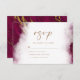 Les bords de cette élégante carte RSVP moderne présentent un design de bordure d'aquarelle rouge bordeaux en imitation de marbre veiné de faux feuille d'or, se fondant graduellement dans l'arrière - plan blanc. Les lettres "rsvp" apparaissent en écriture manuscrite de couleur or. La date et le libellé de réponse personnalisables sont en texte serif gris charbon. L'envers affiche un design en marbre rouge et or assorti.