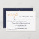 Carte RSVP élégante personnalisable avec un choix de menu pour un mariage. Il est parfait pour un mariage moderne et élégant. Le texte est dans un script moderne et dans une couleur pêche. L'arrière - plan est de couleur bleu nuit. Cette carte de réponse mariage demande à vos invités quel repas ils souhaitent à votre réception et le nombre de menus. Vous pouvez modifier les informations sur la carte pour qu'elles correspondent à vos besoins. Cette carte RSVP correspond à tous les articles de la collection Mariage bleu rose de minuit jaune, que vous pouvez trouver sous cette carte.