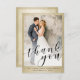 Merci à vos invités mariages dans le style avec cette élégante photo personnalisée merci carte à plat. Ce modèle de design typographique présente votre photo sur le devant bordé d'un faux or avec les mots "Merci" et vos noms avec date mariage à personnaliser. Le dos de la carte postale a un message personnalisé et une signature sur un faux arrière - plan or. Conçu par l'artiste Susan Coffey.