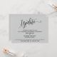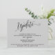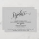 La distinction de cette suite est due à la police de script complexe et tourbillonnante utilisée pour les phrases d'accent. Dans l'éventualité où vous devez informer vos invités que votre mariage a été reporté, cette carte offre une option simple et élégante. Dans cette pièce, la police calligraphie a été utilisée pour créer un graphique représentant le mot "Mise à jour". Utilisez les champs modèles pour ajouter vos données personnelles et faire de cette conception votre propre. L'arrière - plan peut être changé en n'importe quelle couleur. Veuillez communiquer avec toute demande spéciale ou customiser de l'aide. // 98 //