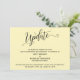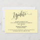 La distinction de cette suite est due à la police de script complexe et tourbillonnante utilisée pour les phrases d'accent. Dans l'éventualité où vous devez informer vos invités que votre mariage a été reporté, cette carte offre une option simple et élégante. Dans cette pièce, la police calligraphie a été utilisée pour créer un graphique représentant le mot "Mise à jour". Utilisez les champs modèles pour ajouter vos données personnelles et faire de cette conception votre propre. L'arrière - plan peut être changé en n'importe quelle couleur. Veuillez communiquer avec toute demande spéciale ou customiser de l'aide. // 98 //