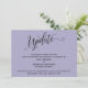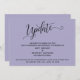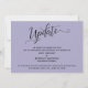 La distinction de cette suite est due à la police de script complexe et tourbillonnante utilisée pour les phrases d'accent. Dans l'éventualité où vous devez informer vos invités que votre mariage a été reporté, cette carte offre une option simple et élégante. Dans cette pièce, la police calligraphie a été utilisée pour créer un graphique représentant le mot "Mise à jour". Utilisez les champs modèles pour ajouter vos données personnelles et faire de cette conception votre propre. L'arrière - plan peut être changé en n'importe quelle couleur. Veuillez communiquer avec toute demande spéciale ou customiser de l'aide. // 98 //