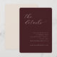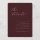 This elegant wedding enclosure card features a sophisticated maroon background with an understated, cursive typography that adds a touch of timeless charm. The design is simple yet refined, focusing on the essential details in a clean and modern layout. Perfect for conveying important information about accommodations and additional wedding details, this card exudes a sense of grace and formality, making it ideal for couples aiming to create a cohesive and polished look for their special day. Its minimalist style ensures it complements any wedding theme while maintaining a focus on clarity and elegance.