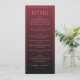 This elegant wedding menu features a vertical layout with a deep maroon background, creating a sophisticated and formal atmosphere. The design uses clean serif fonts for headings and sans-serif fonts for the body text, ensuring readability and modernity. Each section is well-spaced, enhancing the structured appearance, while gold accents add a touch of luxury. Perfect for high-end events, this template offers customizable placeholders for names and dates, making it ideal for personalizing your special day.