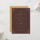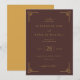 This elegant wedding invitation features a deep maroon background with gold geometric borders, creating a sophisticated and formal aesthetic. The design includes a mix of serif, sans-serif, and script fonts in gold, enhancing readability and visual appeal while maintaining an air of celebration. Customizable text fields allow for personalization, making it perfect for couples looking to add their unique touch to their special day. The overall mood is one of elegance and refinement, ideal for a memorable wedding ceremony.