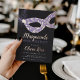 Elegant masquerade ball invitations for your sweet sixteen birthday celebration feature an ornate mask in orchid purple and rose gold foil, adorned with a feather. Personalize with your Sweet 16 party details beneath in calligraphy script and block lettering.