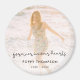 A modern, minimalist full photo funeral favour keepsake fridge magnet to celebrate the life of your loved one in a minimalist clean simple design style featuring a elegant handwritten script font and a soft pastel peach background. The design template can easily be personalized with your own photo and text to create a special tribute for your loved one's funeral, memorial or celebration of life. The image shown is for illustration purposes only to be replaced with your own photo. The placeholder image shows a happy young woman with wavy long blonde hair wearing an elegant chic pastel floral summer dress standing in the sea at sunset on a sandy beach in the shallow breaking waves.