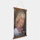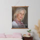Elegant memorial photo portrait hanging tapestry to remember and celebrate the life of a departed loved one. Their photo is overlayed with "In Loving Memory" in white script and their name and birth and death dates.
