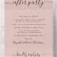 Modern blush pink elopement or private wedding announcement and reception convenient all in one invitation. Customize your elopement/wedding announcement, reception invitation and menu choices. "Happily Ever After Party" is written in simple typography and a contemporary script with swashes. A tear away RSVP postcard provides an eco-friendly and envelope-free response from your guests.