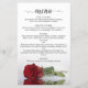 Ces beaux menus mariages sont simples, élégants et élégants tout en étant abordables et abordables. Elles présentent un design chic et glamour avec un titre de calligraphie script et une seule rose rouge réfléchissant dans un bassin d'eau avec vagues et ondulations. Le dos est une belle couleur rouge marbré avec les noms du couple et date mariage en bas.