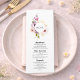 Une belle carte de mariages aux délicates fleurs d'aquarelle dans les tons pastel doux. La typographie élégante et la disposition minimaliste créent une atmosphère sophistiquée et romantique, parfaite pour toute réception de mariage. Entièrement personnalisable avec vos plats, noms et date choisis pour compléter votre journée spéciale.