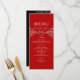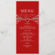 Élégant menu mariage moderne boho noir et rouge avec coeur de corde argentée et dentelle dorée fleurie.