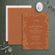 The invitation features an intricate leafy line art motif framing your special invitation details, where you feature the couples' initials in a beautifully crafted monogram. A hand lettered calligraphy font adds an elegant touch that will bring the whole look together, in a timeless colour combo of Burnt Orange and bright white.