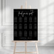 Welcome your guests in style with this elegant minimalist black wedding seating chart poster. Featuring a sleek black background, crisp white modern script, and clear table layout, this design combines sophistication and practicality. Perfect for black-tie, modern, or monochrome wedding themes. Easily customize with your guest names and table numbers to create a personalized, coordinated reception display. Pair it with matching wedding stationery, table numbers, and place cards for a cohesive look. Available in multiple sizes to fit your venue.