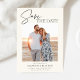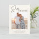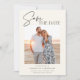 A modern ivory save the date photo announcement featuring a black calligraphy script font and simple minimalist design. This unique save the date card is a trendy way to announce your wedding. THE SAMPLE PHOTO IS NOT INCLUDED. REPLACE WITH YOUR OWN PHOTO BEFORE ORDERING.