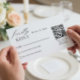 This elegant minimalist RSVP wedding card features a clean black and white design with modern typography and a convenient QR code for easy online replies. Perfect for contemporary couples looking for a stylish and functional way to gather guest responses. Customize the date, names, and details to match your wedding theme effortlessly. Ideal for modern, classic, or timeless wedding stationery suites.