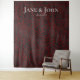 Elegant and minimalist wedding photo wall backdrop featuring a sophisticated black leopard print pattern on red background. Silver typography for newlyweds names and wedding date. Created for the bold, stylish, fierce and daring couple who love big cats, especially pumas and panthers. Ideal wedding decoration or as a wedding photo booth wall backdrop.