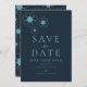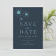 Beautiful minimalist retro geometric daisy pattern with elegant typography script blue wedding save the date invitation. Simple daisies in dusty blue, light blue simplistic line art on a dark navy blue background. Original minimalistic artwork by artist Catherine Sweetman