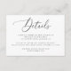 This refined wedding details card features a minimalist white background, elegant calligraphy style script for the header, and classic serif type for the main text. Perfect for sharing hotel accommodations, website information, or other important wedding logistics with guests. The timeless black and white design complements a wide range of wedding themes, from formal and black-tie to modern and minimalist.