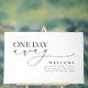 This beautifully designed horizontal rehearsal dinner welcome sign combines simplicity, modernity, and elegance in a unique, minimalist style. The mix of flowing script and refined classic serif fonts creates a harmonious blend of romance and contemporary sophistication. Its clean and sleek design, paired with the glossy white acrylic, makes a bold and inviting statement, setting the perfect tone for your special evening. The "One Day Away" message builds excitement for the big day, while the minimalist aesthetic keeps the vibe fashionable and fresh. What makes this sign truly special is its flexibility - both the text and background colours can be customized to perfectly match your wedding theme and rehearsal dinner atmosphere. Whether you're aiming for a soft, romantic look or something bold and modern, this sign will add a personal touch, making your rehearsal dinner feel welcoming and memorable for all your guests.