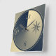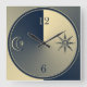 This elegant minimalistic clock has only four numbers: 3,6,9 and 12. 3 o'clock and 9 o'clock are embedded in a sun and a moon ornament. The background has a gradient from darblue (for the night) to light and pale yellow (for the day) which is repeatet opposite outside the circle. Diese elegante minimalistische Uhr zeigt nur 4 Stunden: 3,6,9 und 12. 3 Uhr und 9 Uhr sind von einem Sonnen- und Mondornament umgeben. Der Hintergrund verläuft von Dunkelblau (für die Nacht) zu hellem blassem Gelb (für den Tag) was außerhalb des Kreises in entgegengesetzter Weise aufgegriffen wird.