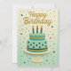 A stylish birthday design featuring a two-tier mint green cake decorated with black polka dots, gold stripes, and wavy icing. Three black and gold striped candles sit on top, their golden flames adding warmth. The cake stands on a cream pedestal against a festive background of scattered confetti in mint, gold, and black. The elegant paper-cut style and refined colour palette make this design perfect for sophisticated birthday greetings and celebrations.