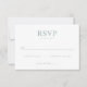 This elegant wedding RSVP card features a minimalist design with ample negative space, creating a clean and sophisticated look. The soft mint green text contrasts beautifully against the light grey background, enhancing readability while maintaining an understated charm. The layout includes customizable fields for names and attendance numbers, ensuring personalization without compromising on style. Perfect for conveying formality and anticipation, this card is ideal for couples seeking a modern yet classic touch for their special day.