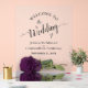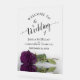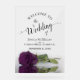 Welcome your wedding guests with this beautiful acrylic sign. The romantic design features a single long stemmed plum purple coloured rose lying on its side mirrored in a pool of water. The elegant script calligraphy title includes lacy swashes or flourishes on the ends of the letters, and the names of the couple and wedding date appear below.