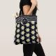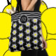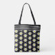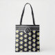 An elegant black and white tote bag with a floral pattern and four horizontal stripes at the top . Personalize it with an initial . This design is also available in cyan , light green and red .