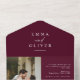 This all-in-one invitation features a clean and simple block serif typography font and calligraphy on a burgundy background. The simplicity of this design adds a touch of elegance to your wedding and works well with all wedding themes and definitely a great addition to your wedding. Just customize the names and wording in a few easy steps and personalize the all-in-one invitation card with your photo of the happy couple and type in the QR Code to give your invitation a nice personal touch. This invitation will save you money to send everything at once. It has a perforated RSVP postcard can be easy to tear off and your guest just sends it to you. Just simply fold each card into the outlined shape -- seal and send to your guests. No envelope is needed for shipping -- just postage.