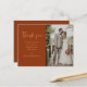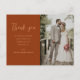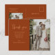 Express your gratitude with a touch of elegance by sending this stylish and trendy Elegant Modern Minimalist Photo Wedding Thank You Postcard. This minimalist yet modern postcard is the perfect way to thank your guests and loved ones for making your special day unforgettable. The elegant script font adds a personal touch to your message, while the simple and minimal design keeps it stylish and refined. The warm rust colour of the terracotta background perfectly captures the essence of fall and adds a rustic charm to your thank you note. Include tow photos from your wedding day to make it even more personal while showing your appreciation to your guests.