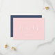 These elegant navy & blush wedding thank you cards feature the message "thanks" in a modern script hand lettering font in white letters with blush pink shadow. Underneath is the couples' names in white in a capitalized coordinating font. The background of the front is light blush pink. The back of the card features a coordinating dark blue navy background. Complete the package with invitations, save the dates, and envelopes in the "Navy & Blush Elegant Script Wedding" collection.