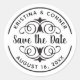 A custom round save the date sticker label embellished with a decorative scroll work emblem. Insert your names and date in place of the sample text shown in the design template. Designed for you by Blackberry Boulevard.