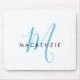 Elegant Modern White Sky Blue Script Monogram Mouse Pad. An elegant sky blue script monogram combined with a clean black san-serif font makes for a contemporary look.