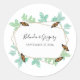 This design features an elegant monarch butterfly and leaf design. The gold geometric frame is surrounded by vintage watercolor leaves. The orange and black butterflies are attracted to the greenery. Damask leaf pattern using green watercolor tones. The combination of colours creates a sophisticated, trendy and chic style. Elegant wedding sticker design with modern elements. The simple setup of the typography gives it a distinct style. Matching wedding invitations and other stationery items are also available.