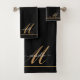 Élégant monogramme personnalisé en or noir script nom de toilette serviette de bain set bordures d'or. Rafraîchissez votre décor de salle de bain avec un style typographique minimaliste.