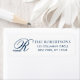 An elegant minimalist return address label featuring your monogram initial letter R in script typography. Personalize with your name and address in a simple dark navy blue typography.