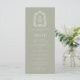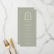 This elegant vintage-inspired wedding menu design features a pair of white monogram initials in open serif font above and below a dividing line and encircled by a line art botanical crest on a sage green background. The back of the card is solid sage green.