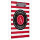 Elegant monogram design in circles with floral decoration on white and red striped background