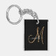 Personalized key chain featuring a gold sans serif initial and name on a black background. Made of ultra-durable acrylic and UV resistant and waterproof. A trending modern minimalist typography style. Click on "customize further to use our simple design tool to choose a different initial or name font.
