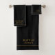 Personalized elegant monogram black gold serif first name and script last name, bathroom towel set gold border on black. Refresh your bathroom decor with a minimalist typographic style.