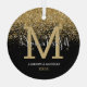 Family monogram christmas glass ornament featuring a trendy black background, a elegant gold glitter waterfall design, your initial, family name, first names, and the year.