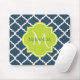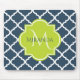 An elegant navy blue quatrefoil patterned mousepad with a scalloped badge in a vibrant spring green that you can personalize by adding your name and monogrammed initial to. This is part of the Sailor Blue and Lime Punch Spring Collection.