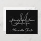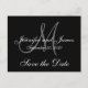 Black Grey Monogram Modern Save the Date postcard. Elke Clarke© for MonogramGallery at Zazzle. Elegant, simple wedding announcement with a grey monogram initial in script typography with white text overlay on a black background. Fully customizable. Other colours and background effects available.