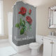 Cute floral illustration of red roses on dark grey background with white family name for bathroom.