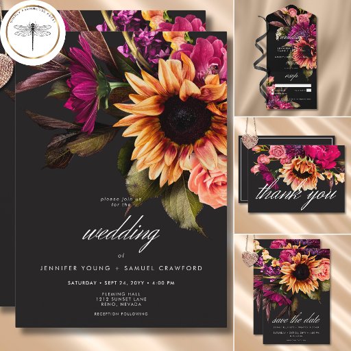 Embrace the opulent beauty of a summer sunset or the rich hues of an autumn harvest with our captivating wedding invitation. A dramatic, yet soft black background provides the perfect canvas for a breathtakingly realistic bouquet. Imagine a vibrant explosion of colour, featuring mums in deep magenta and purple, with soft pink roses alongside bold gold orange sunflowers. Lush, dark green foliage completes the arrangement, adding a touch of natural elegance. This captivating design is perfect for any season, reflecting the passionate intensity of your love story. Your wedding details are showcased in elegant script, ensuring they stand out beautifully against the dramatic backdrop. This enchanting suite creates a truly unforgettable invitation to celebrate your special day. Created by Simply Farmhouse Press.